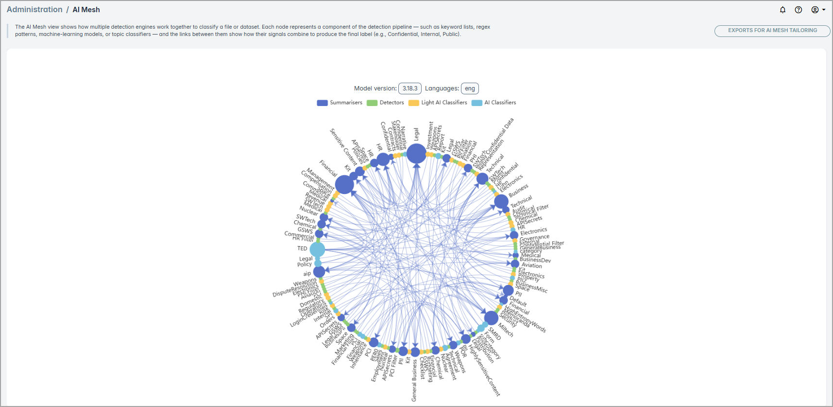 The AI Mesh view visualizes how detection engines work together to determine a file or dataset’s classification. Nodes represent detection components (keyword lists, regex patterns, ML models, topic classifiers), and links show how their results combine to produce the final label (e.g., Confidential, Internal, Public), helping you understand and validate the classification logic.
