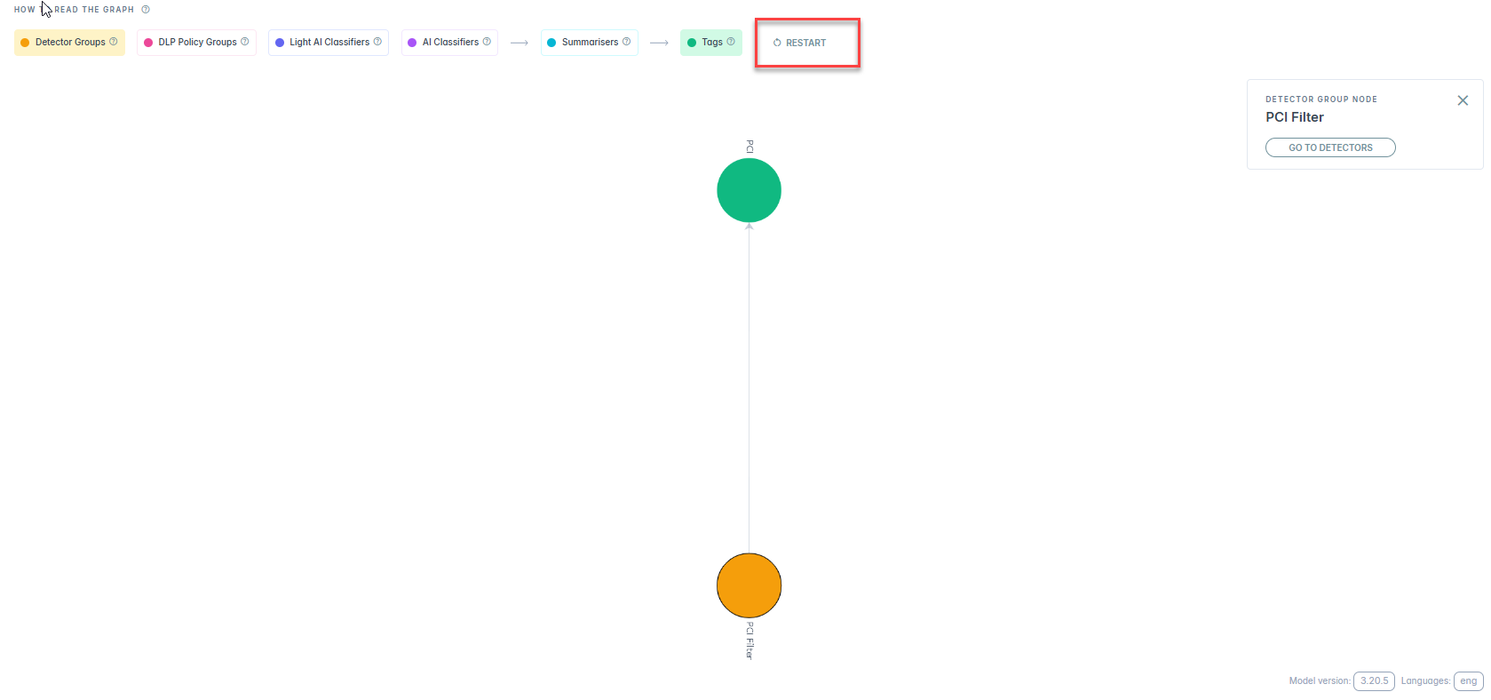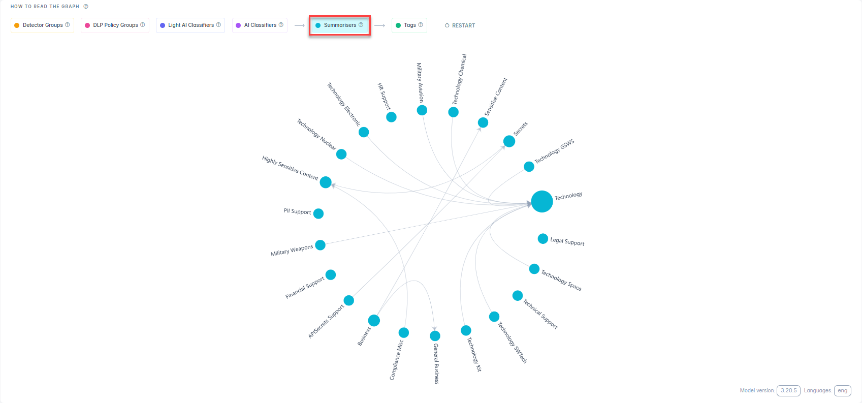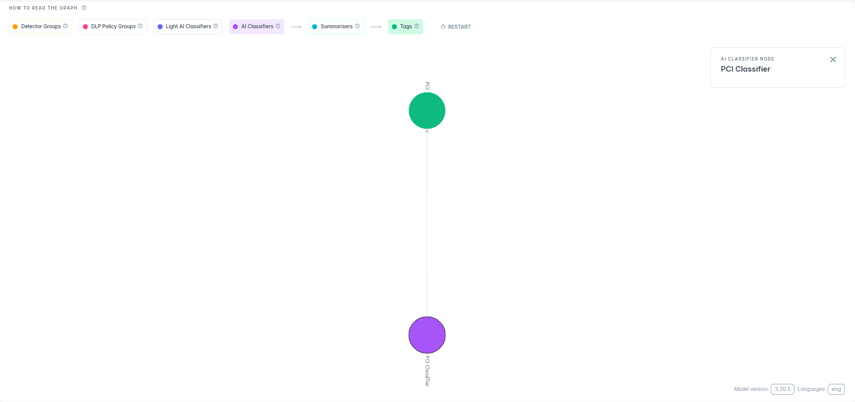 You can view how upstream nodes like Detector Groups, AI Classifiers, DLP Policies, and Summarisers feed into the final decision. Each node shows how its signals influence the classification, helping you trace, audit, and fine tune the AI Mesh.
