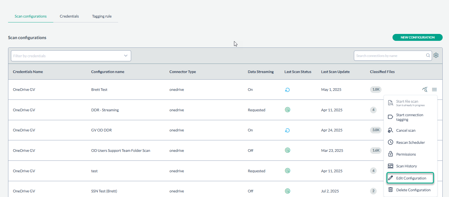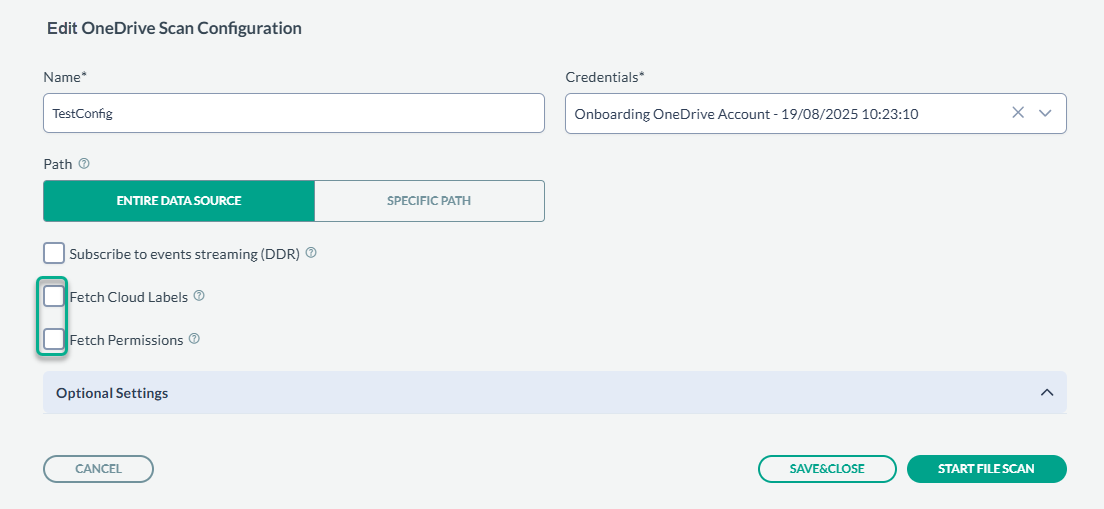 Note: Earlier versions of the product Fetch Cloud Labels and Fetch Permissions options were enabled by default and hidden under Optional Settings. If scans take longer to run you need to check these settings and edit the scan configuration and disable these options if necessary.You can also edit the scan configuration created above later using Edit Configuration. For example, if you observe that you scans are running slow, you can go to the edit view and disable the options Fetch Cloud Labels and Fetch Permissions. An example is shown below: