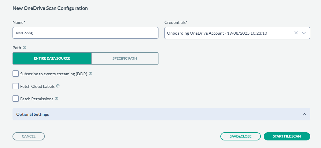 - Fetch Cloud Labels: If selected, then sensitivity (AIP) and custom labels will be fetched for each file discovered in the scan. This data will be available in Cloud Labels field in Enterprise search. However, enabling this option slows down the scan.
