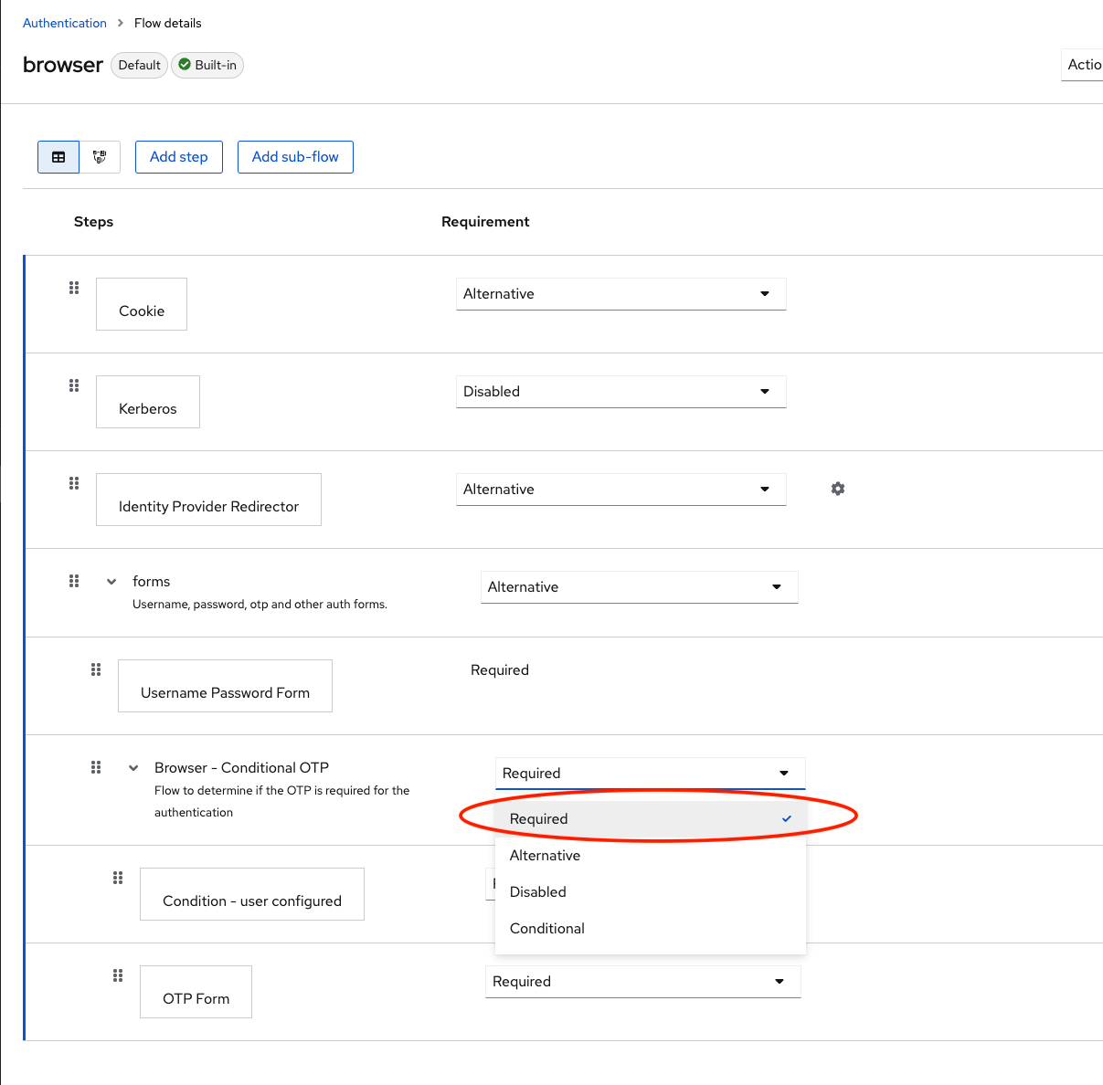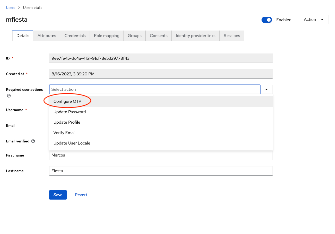 Select the user needed to be added to use 2FA and add Configure OTP under the Required user actions section.