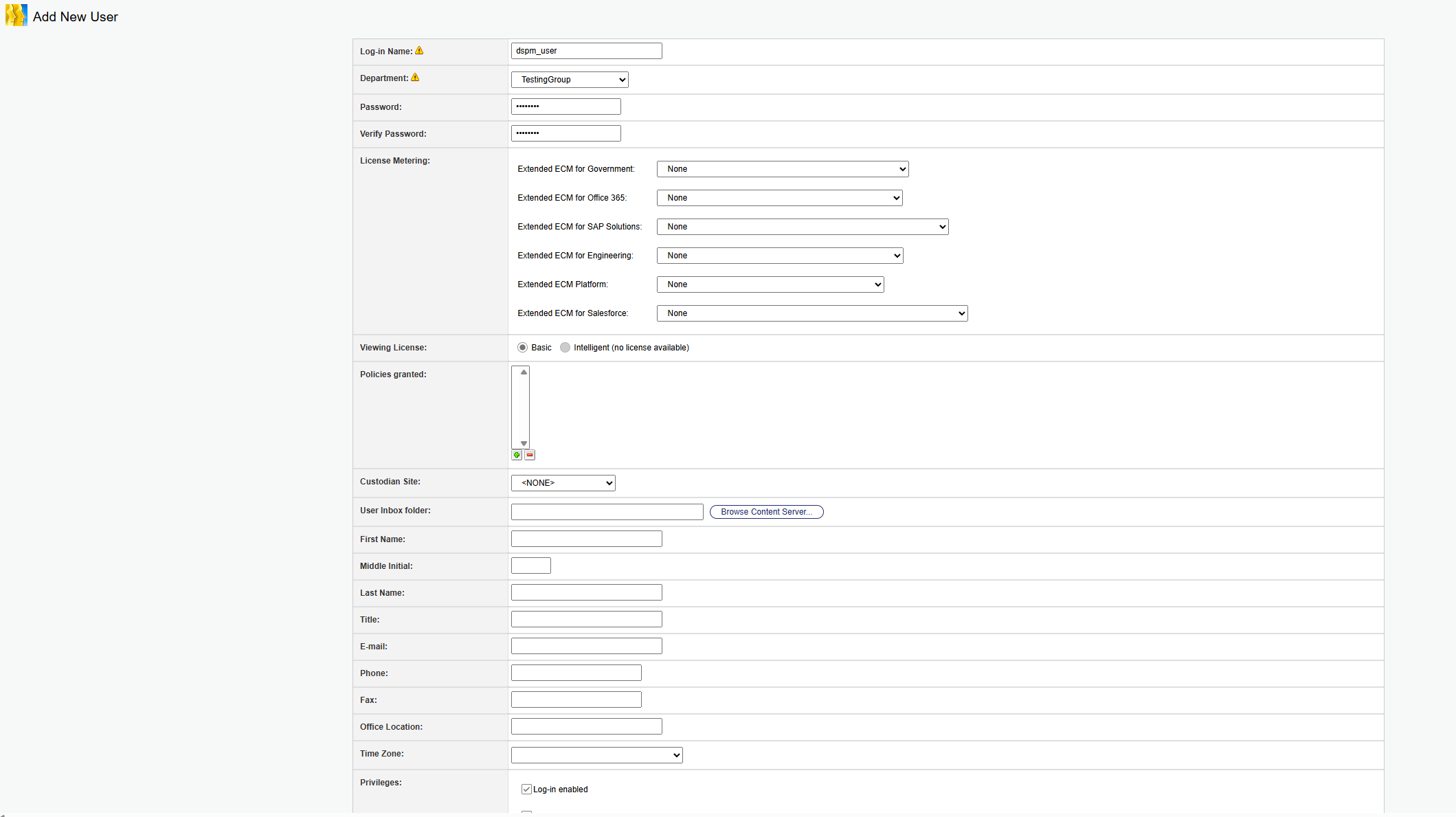 - Fill in the fields Log-in Name, Department, Password, and Verify Password.