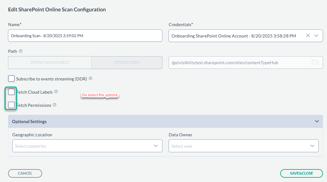 Note: Earlier versions of the product Fetch Cloud Labels and Fetch Permissions options were enabled by default and hidden under Optional Settings. If scans take longer to run you need to check these settings and edit the scan configuration and disable these options if necessary. -