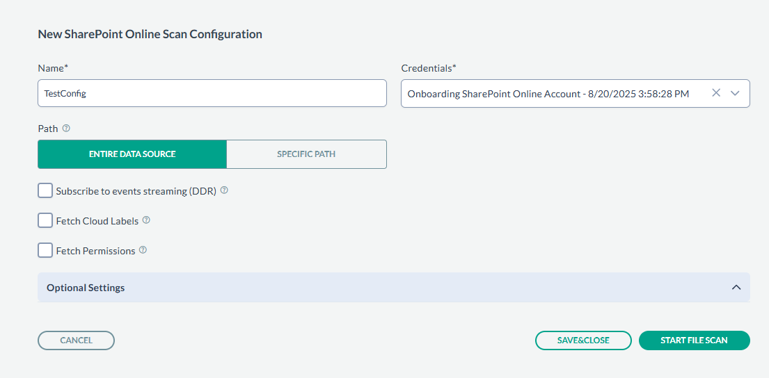 - Fetch Cloud Labels: If selected, then sensitivity (AIP) and custom labels will be fetched for each file discovered in the scan. This data will be available in Cloud Labels field in Enterprise search. However, enabling this option slows down the scan.