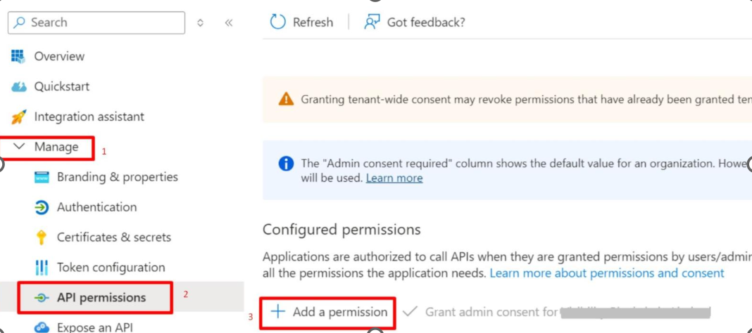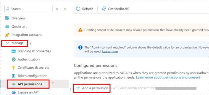 - Navigate to Manage > API permissions on the left menu, and click Add a permission.