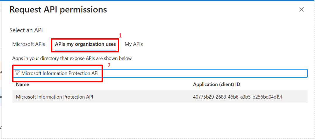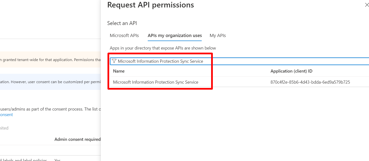 - APIs my organization uses > Microsoft Information Protection API > Application permissions > InformationProtectionPolicy.Read.All