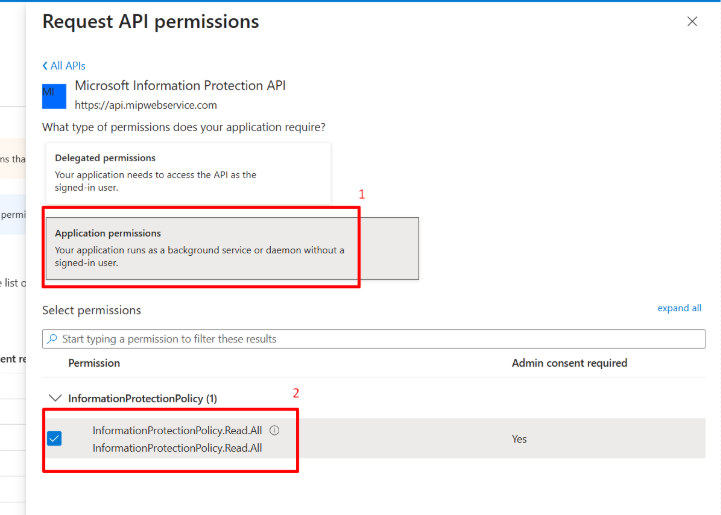 - Select Application permissions > InformationProtectionPolicy.Read.All