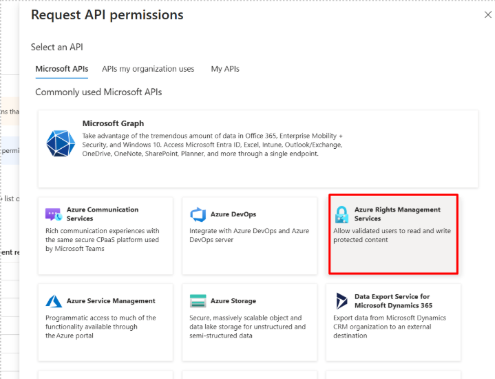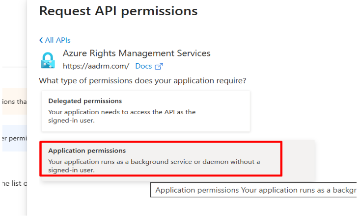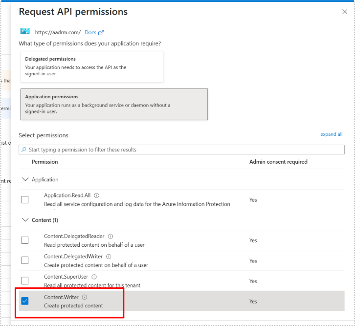 - Azure Rights Management Services > Application permissions > Content.Writer