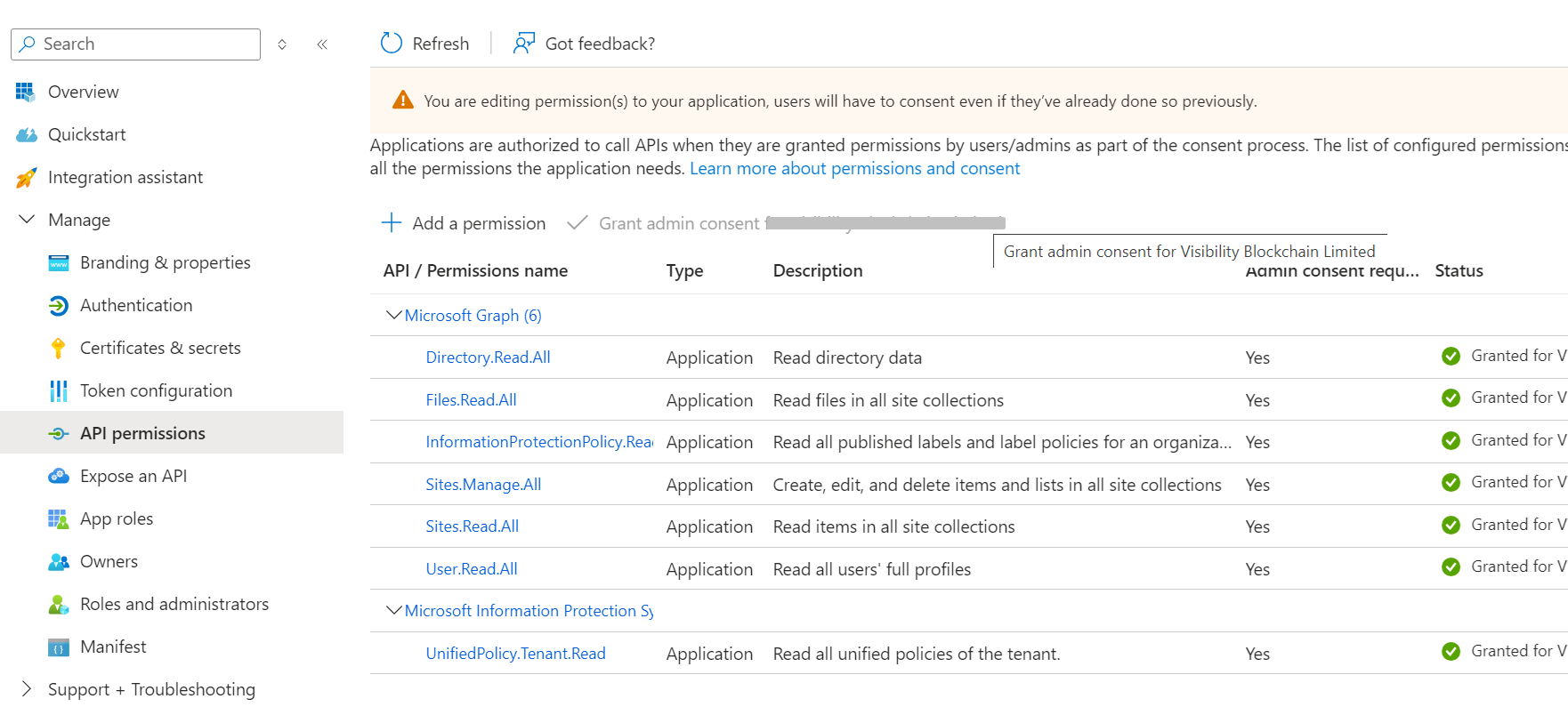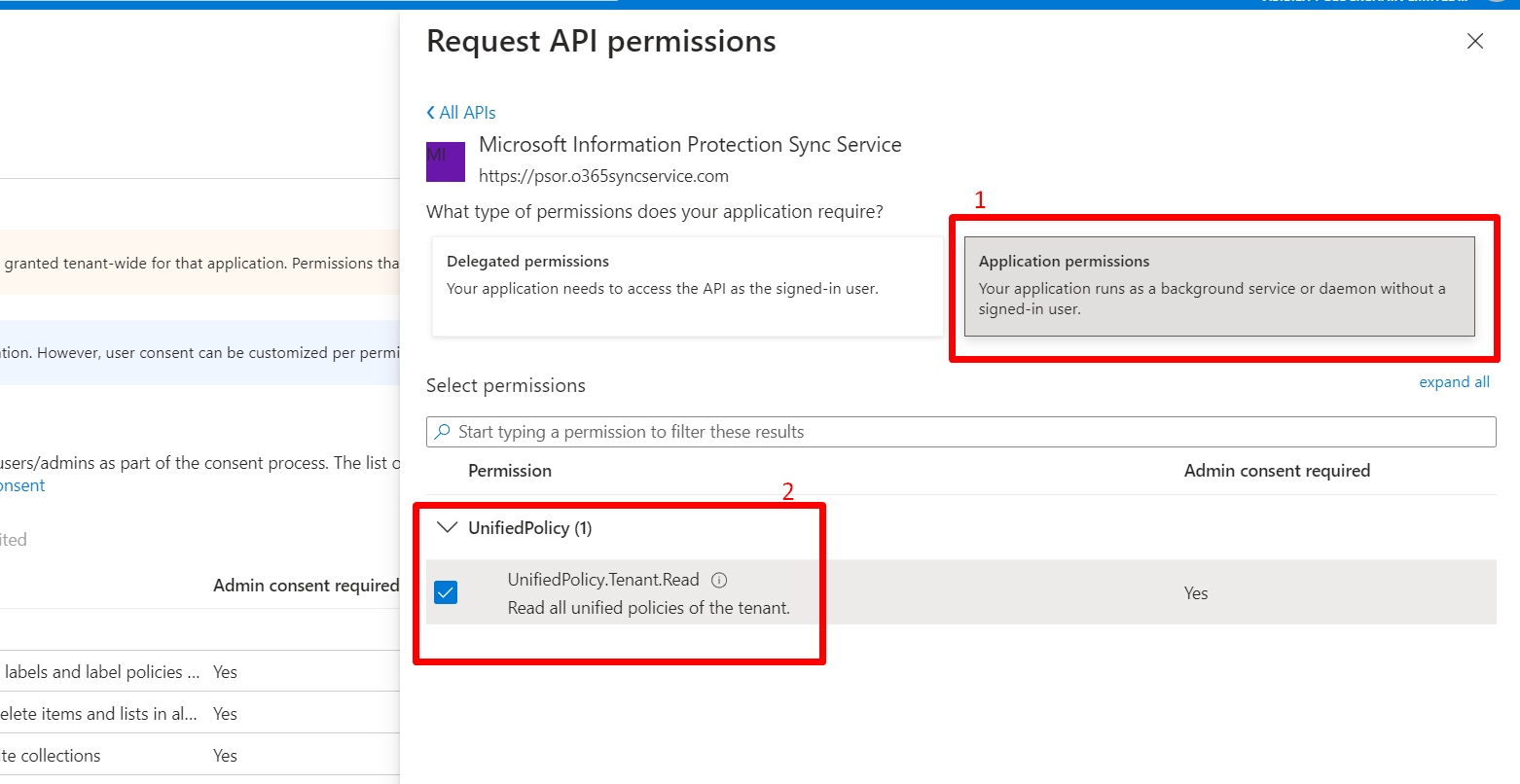 - APIs my organization uses > Microsoft Information Protection Sync Service > Application permissions > UnifiedPolicy.Tenant.Read