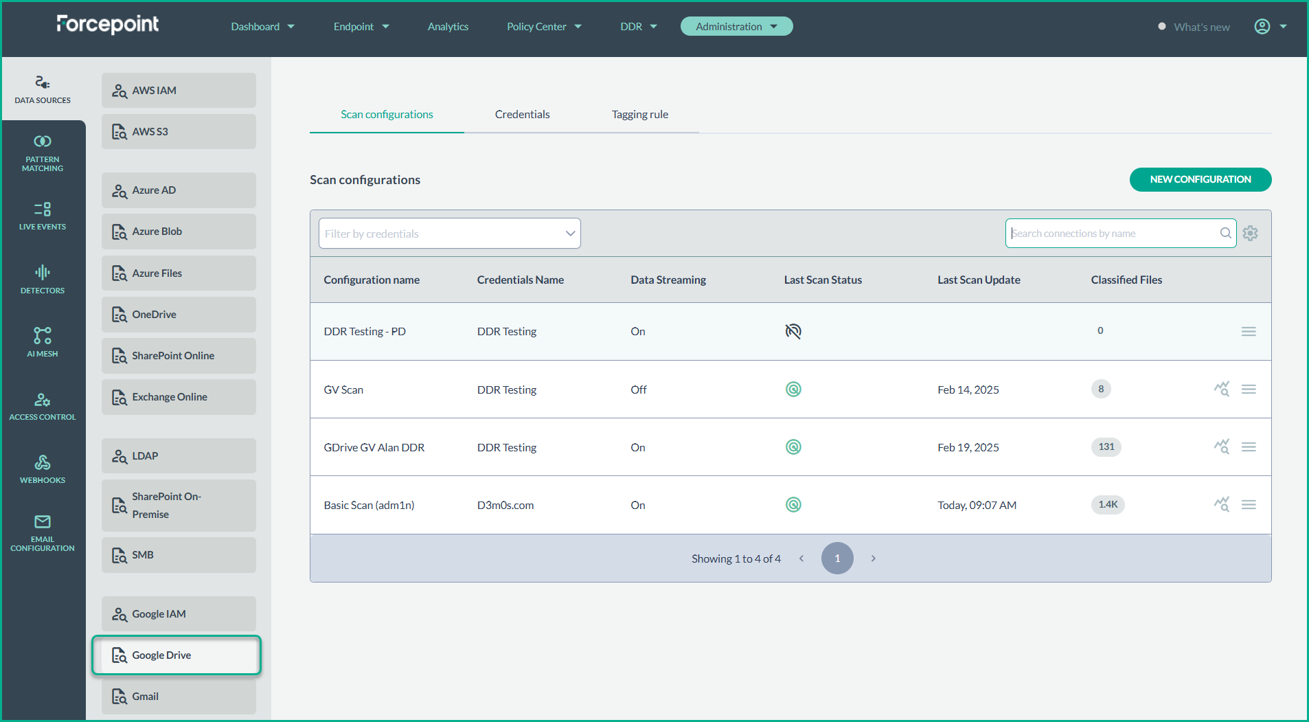 - From the Data Sources page, select Google drive from the list of available data sources. In the Scan Configurations list, create a New Configuration.