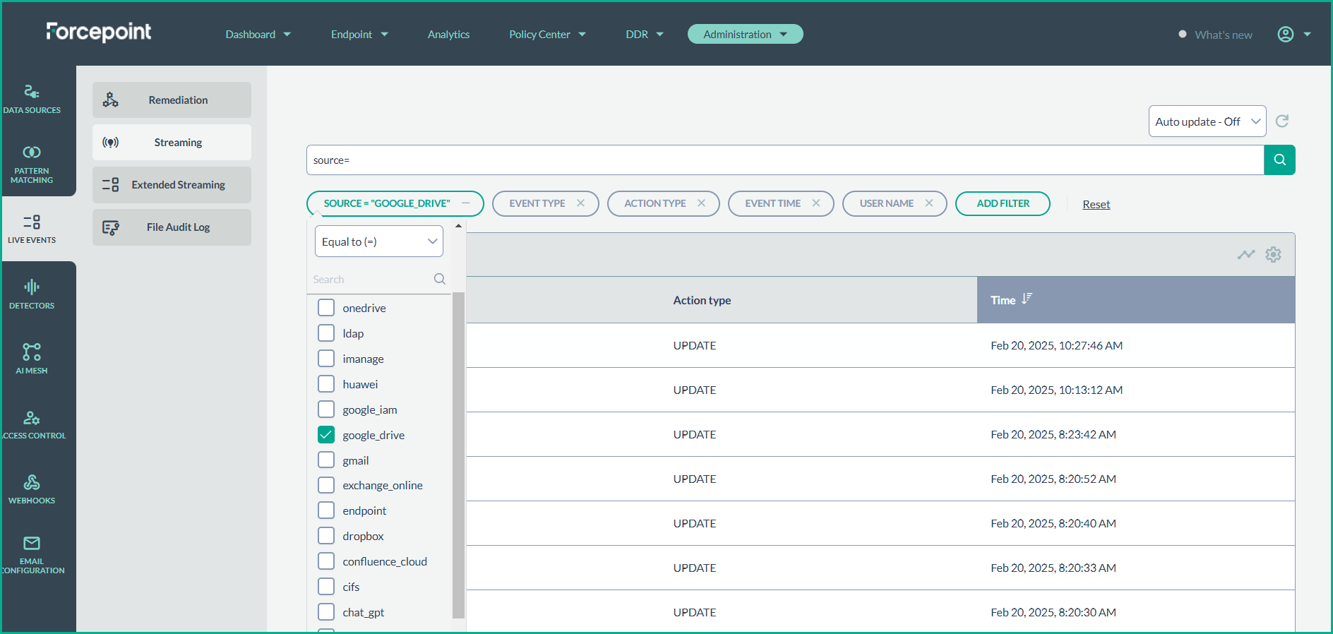 This section provides steps on how to enable real-time data streaming for a Google drive connection and monitor streaming events within the Forcepoint DSPM platform.