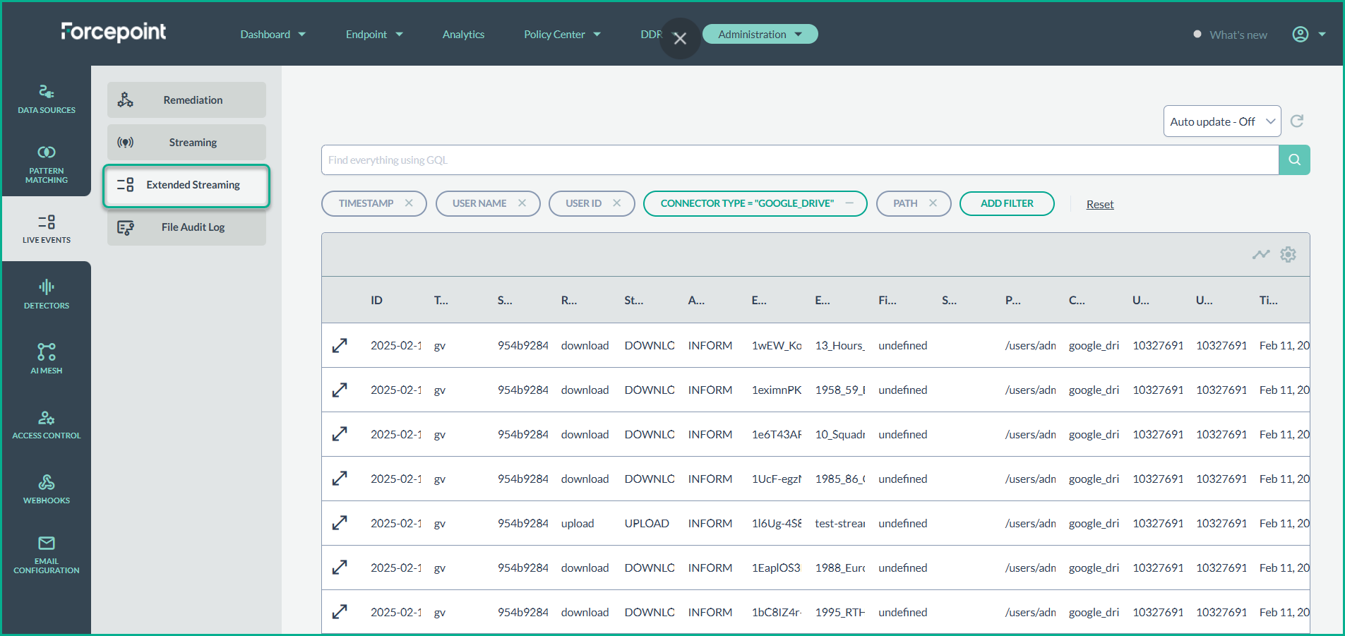 - Navigate to the Live Events section under Administration to view a detailed audit log of all streaming events.
