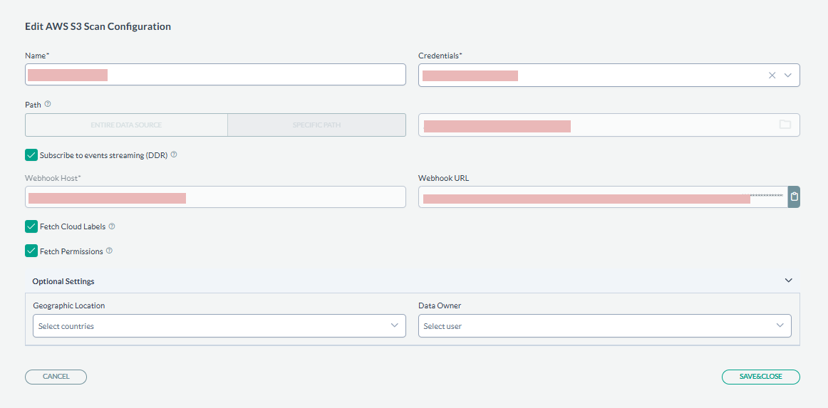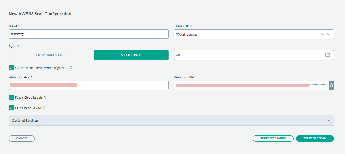 - Create new AWS S3 Scan Configuration. Select path that we would like to track for streaming. Also, select the data streaming checkbox and modify the webhook host if it