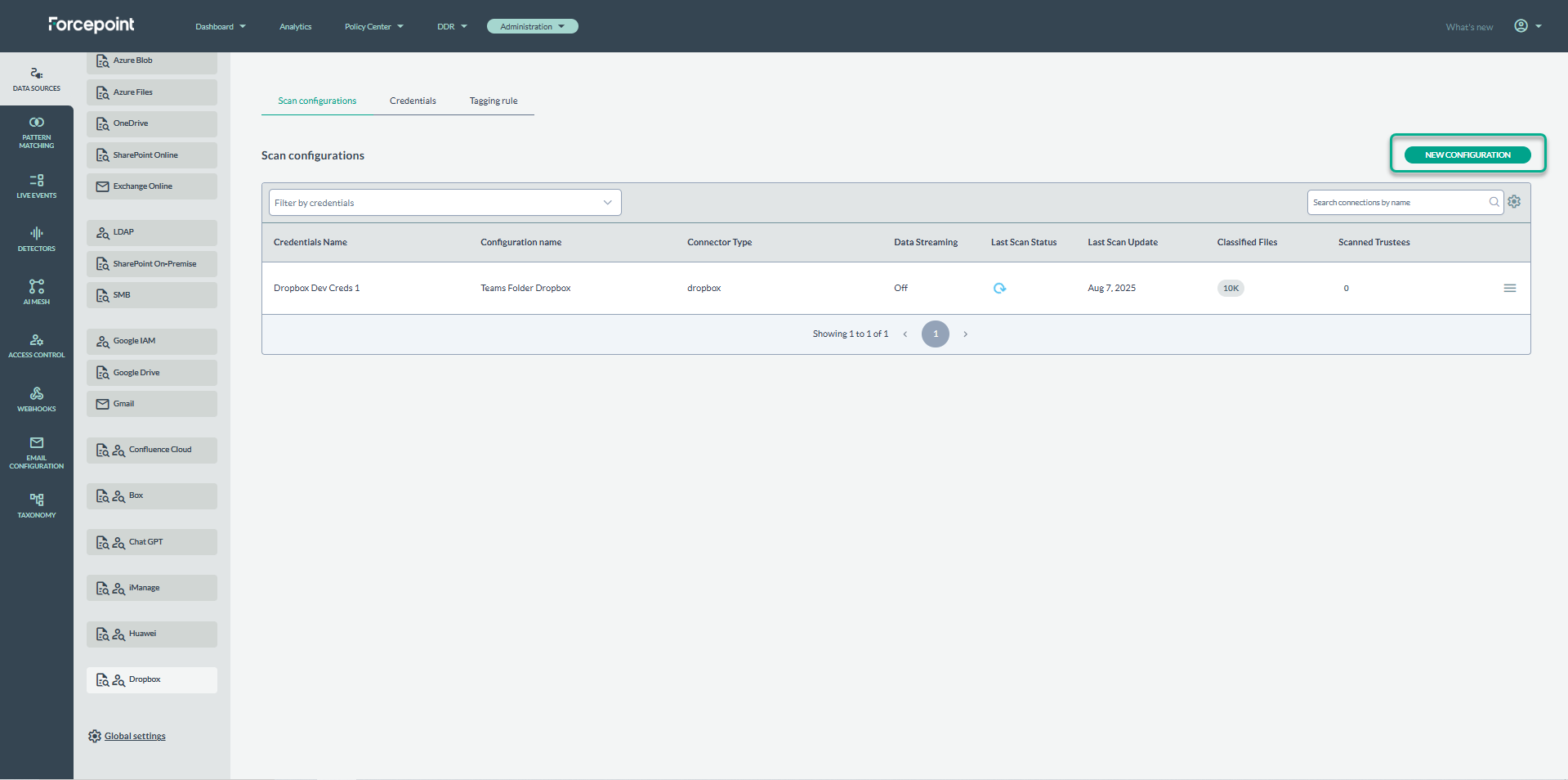 - From the Data Sources page, select Dropbox from the list of available data sources. In the Scan Configurations list, create a New