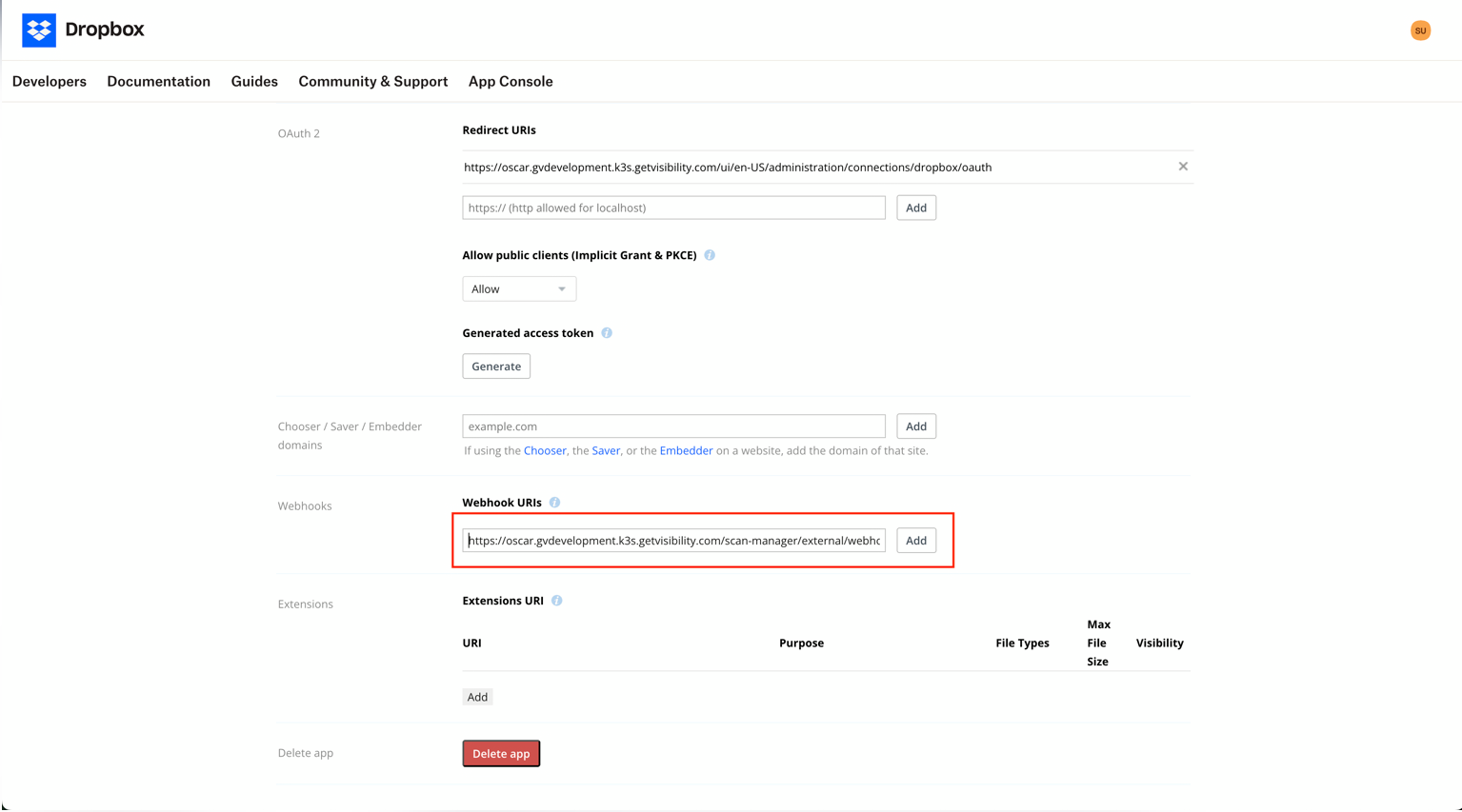- Go to Dropbox App Console, open app Settings for your credentials and paste