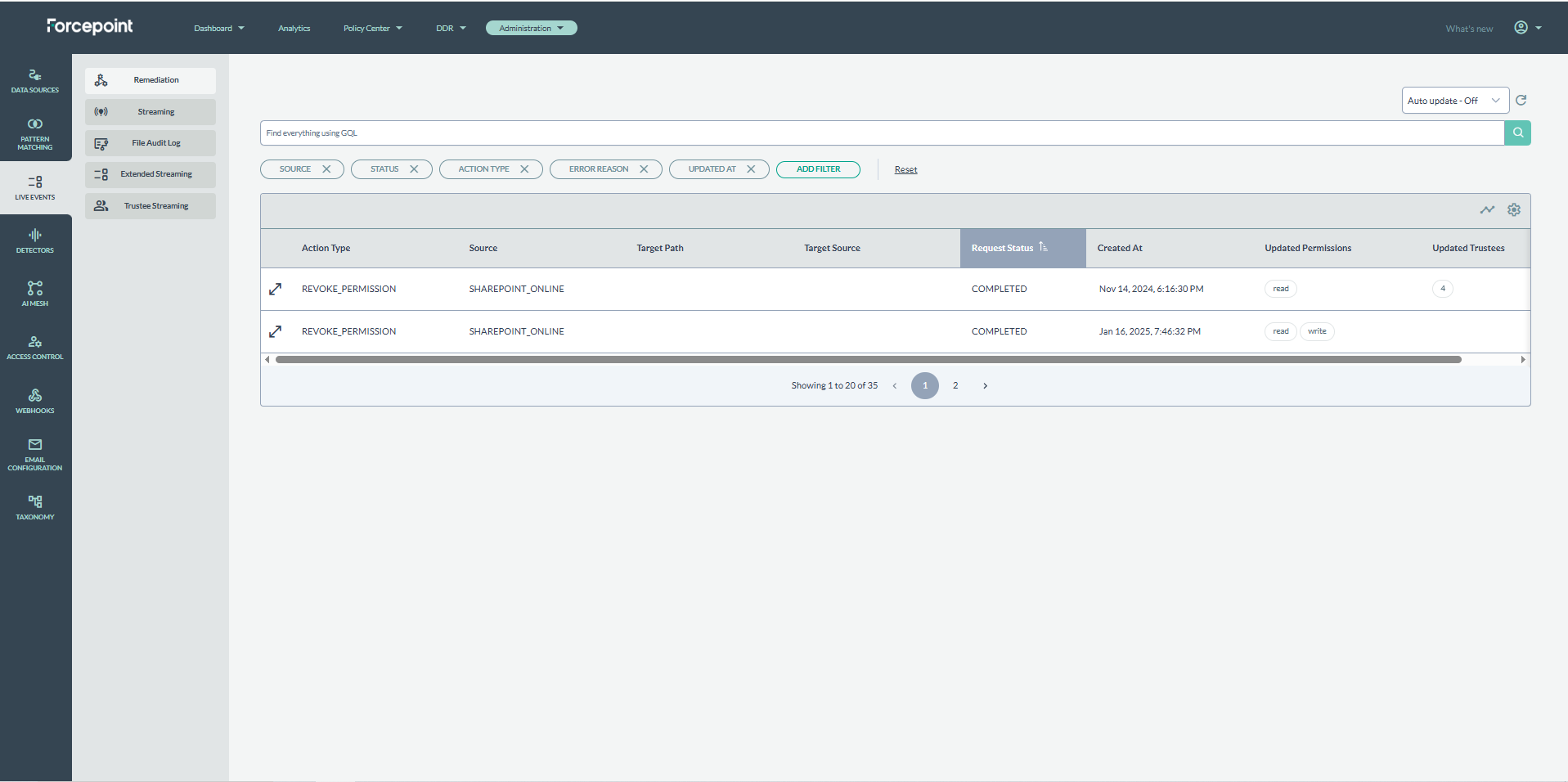 - Navigate to the Live Events section under Administration to view a detailed audit log of all streaming events.