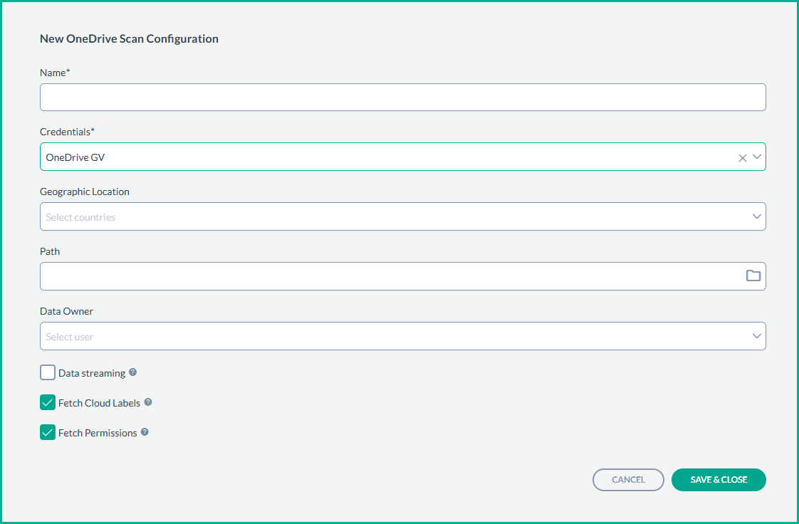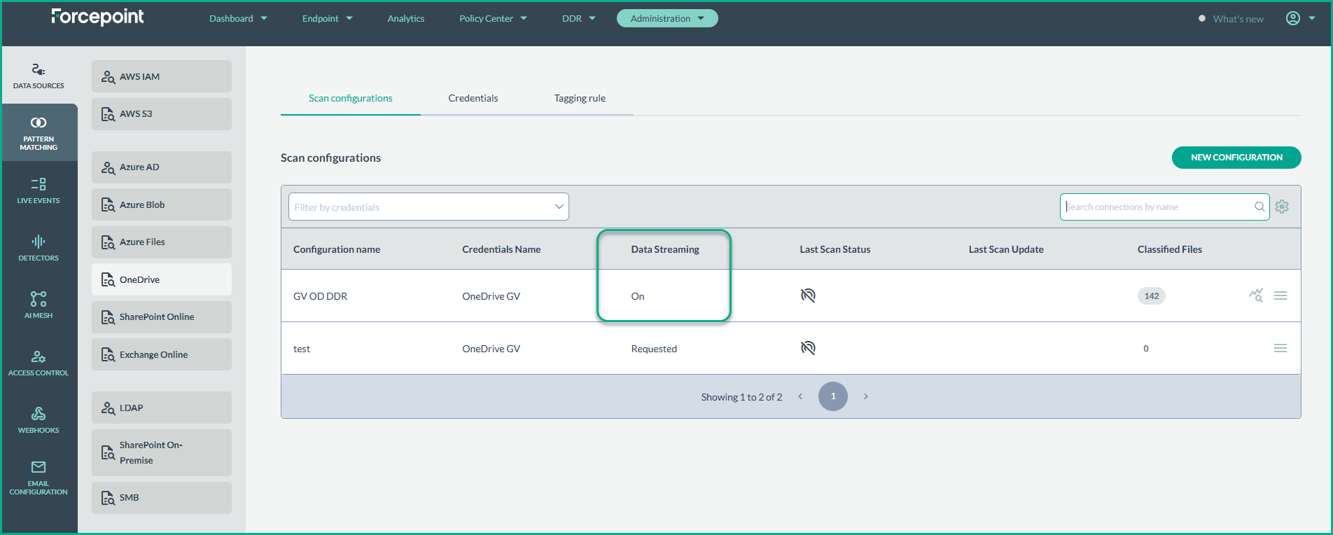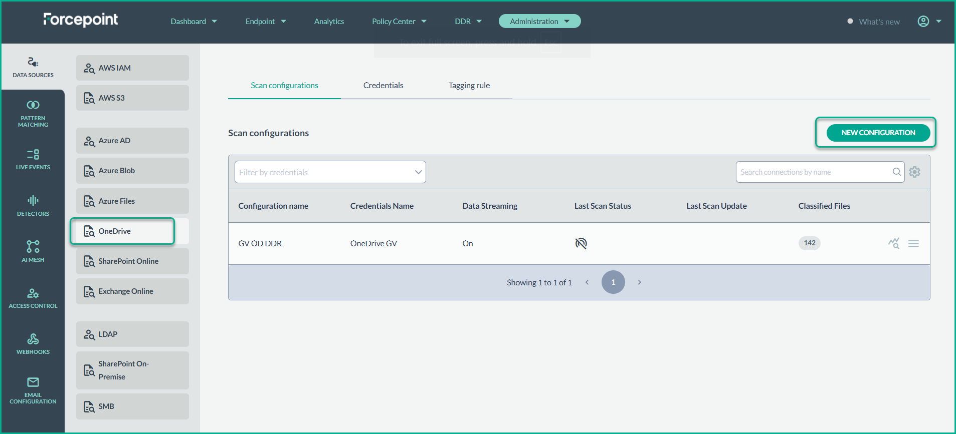 - From the Data Sources page, select OneDrive from the list of available data sources. In the Scan Configurations list, create a New Configuration.