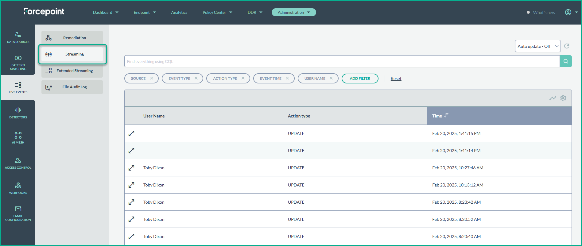 - Navigate to the Live Events section under Administration to view a detailed audit log of all streaming events.