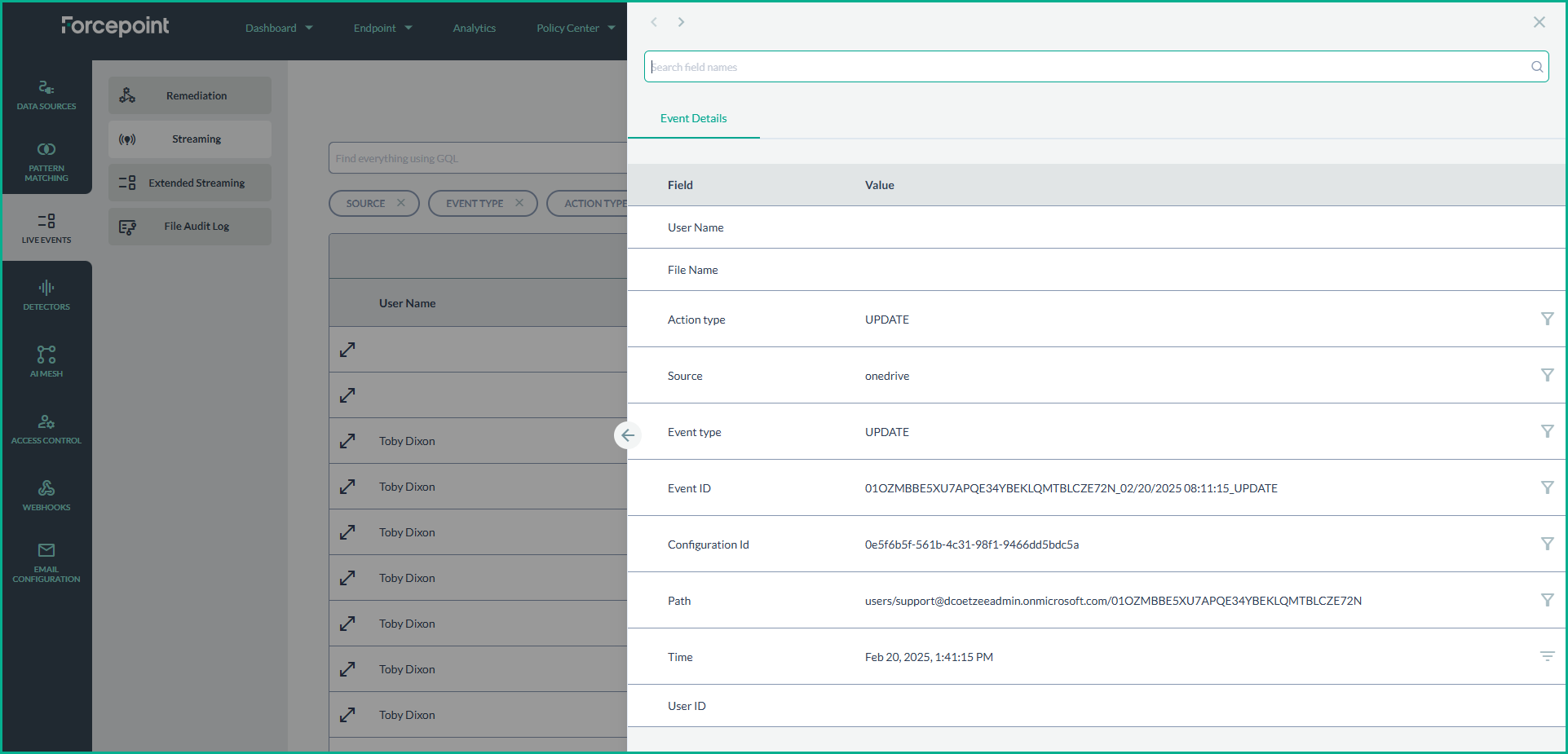 This section provides steps on how to enable real-time data streaming for a OneDrive connection and monitor streaming events within the Forcepoint DSPM platform.