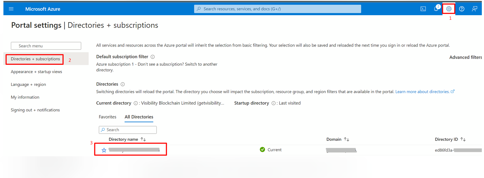 If there are multiple tenants to choose from, use the Settings icon in the top menu to switch to the tenant which needs to be registered to the application from the Directories + subscriptions menu