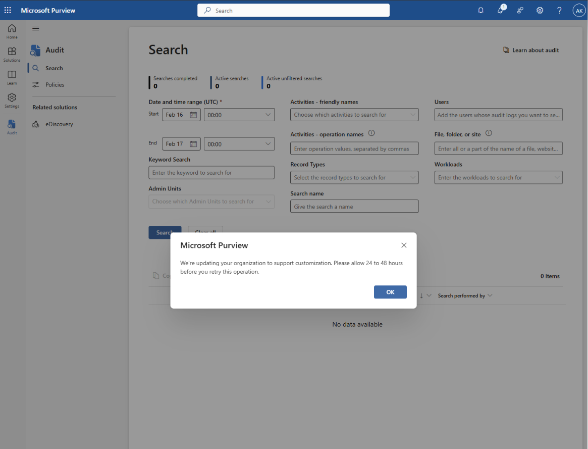 Select the Audit solution card. If the Audit solution card is not displayed, select View all solutions and then select Audit from the Core section