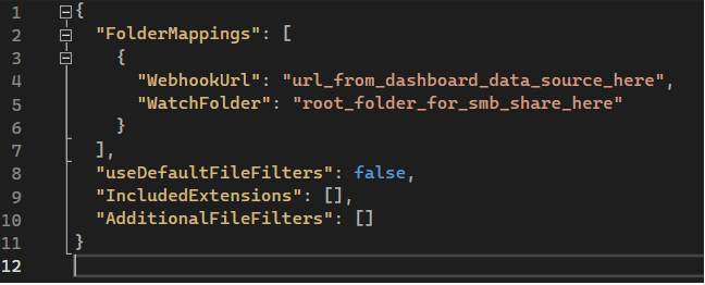 Create a folder mapping for every SMB share on the server that is to be scanned. The watched folder should be the root directory of the share, and the WebhookUrl should be from the scan configuration page for the SMB share on the dashboard (as shown below).