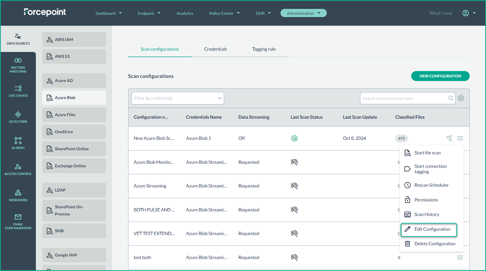 - Find the existing Azure Blob scan configuration and select Edit Configuration from the options menu.