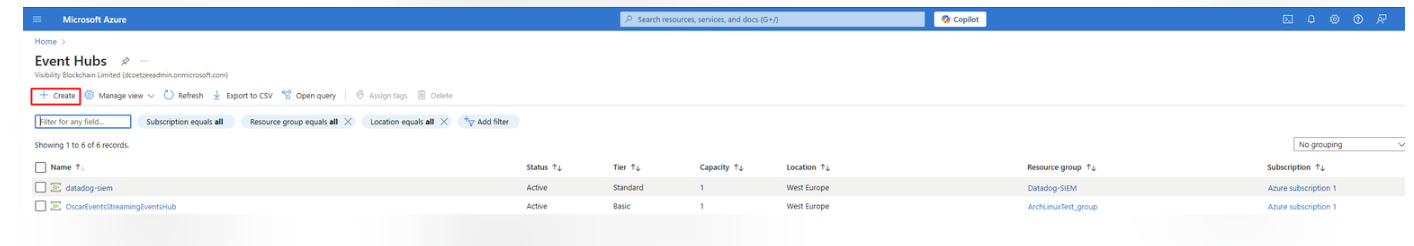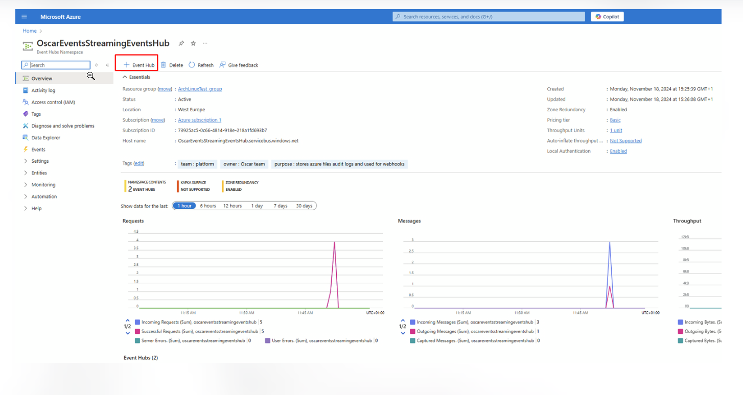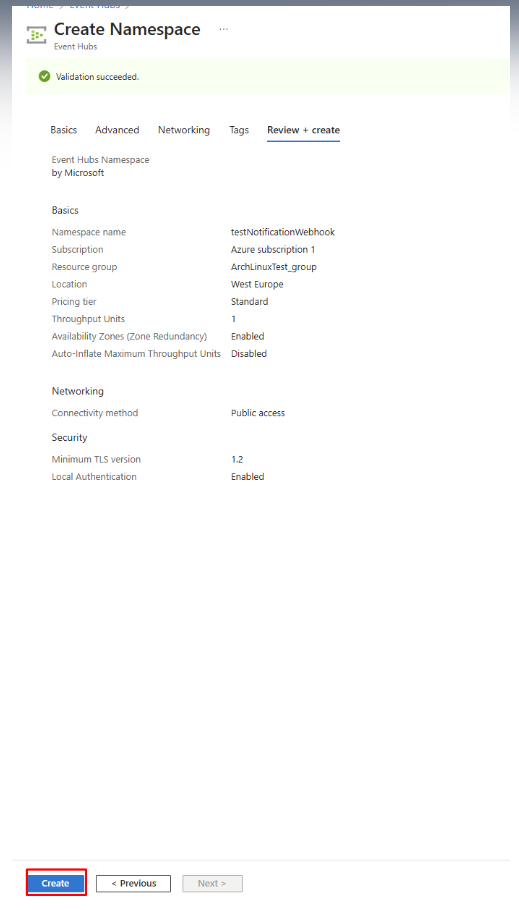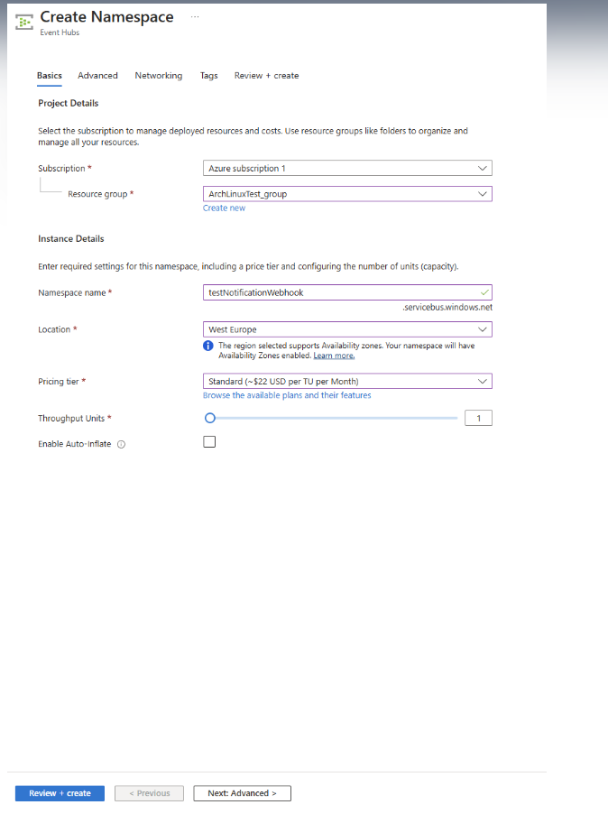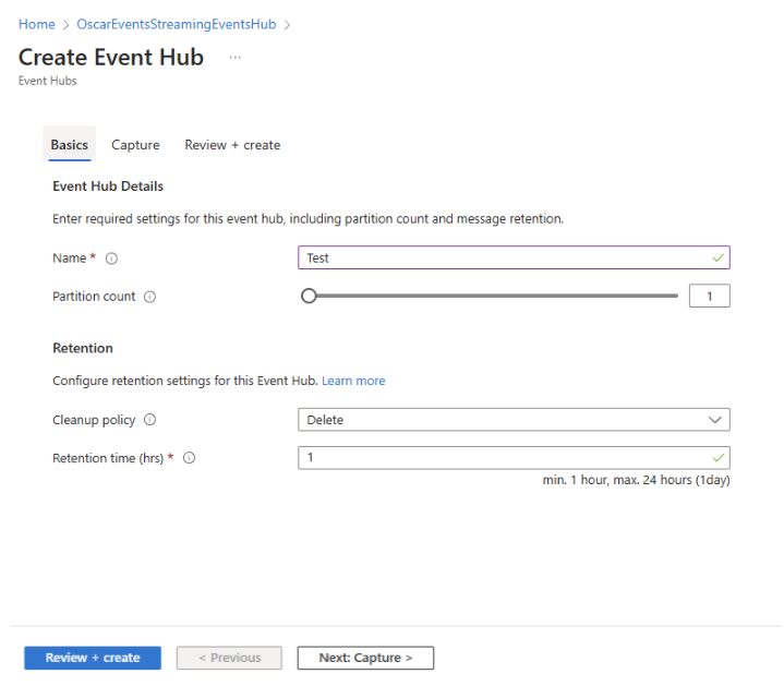- In Create Event Hub Window fill in name and click Create + Review and Create after validation. Save the name of the Event Hub you