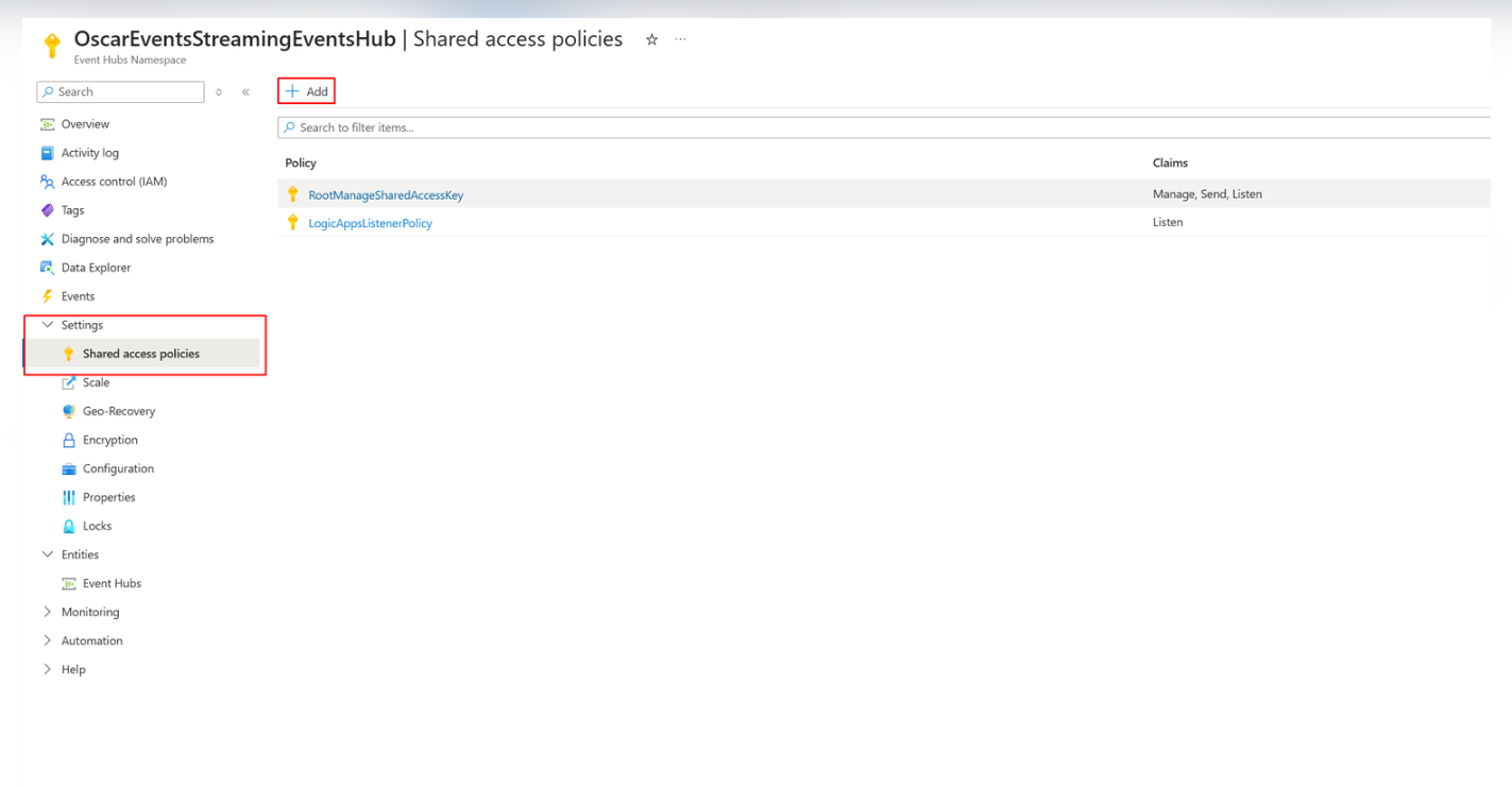 - In the event hubs namespace window click on Settings/Shared access policies and then +Add button.