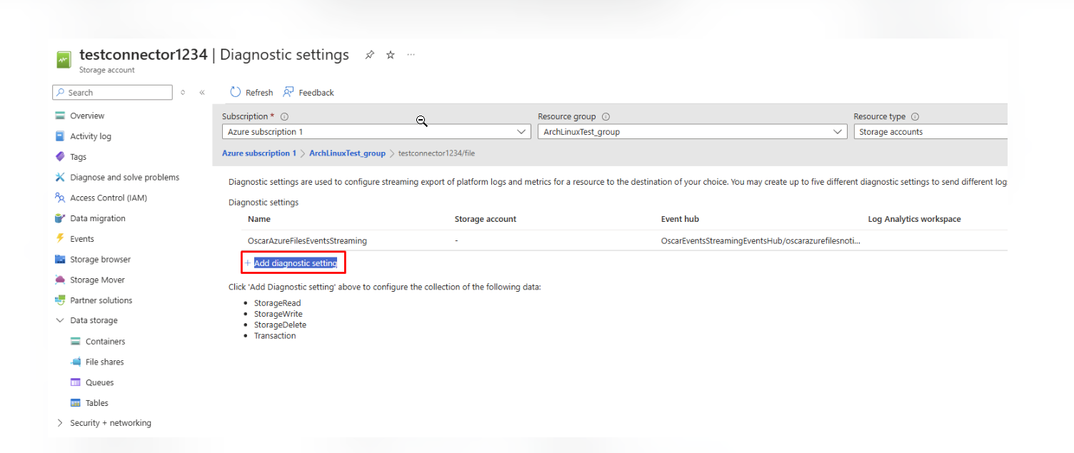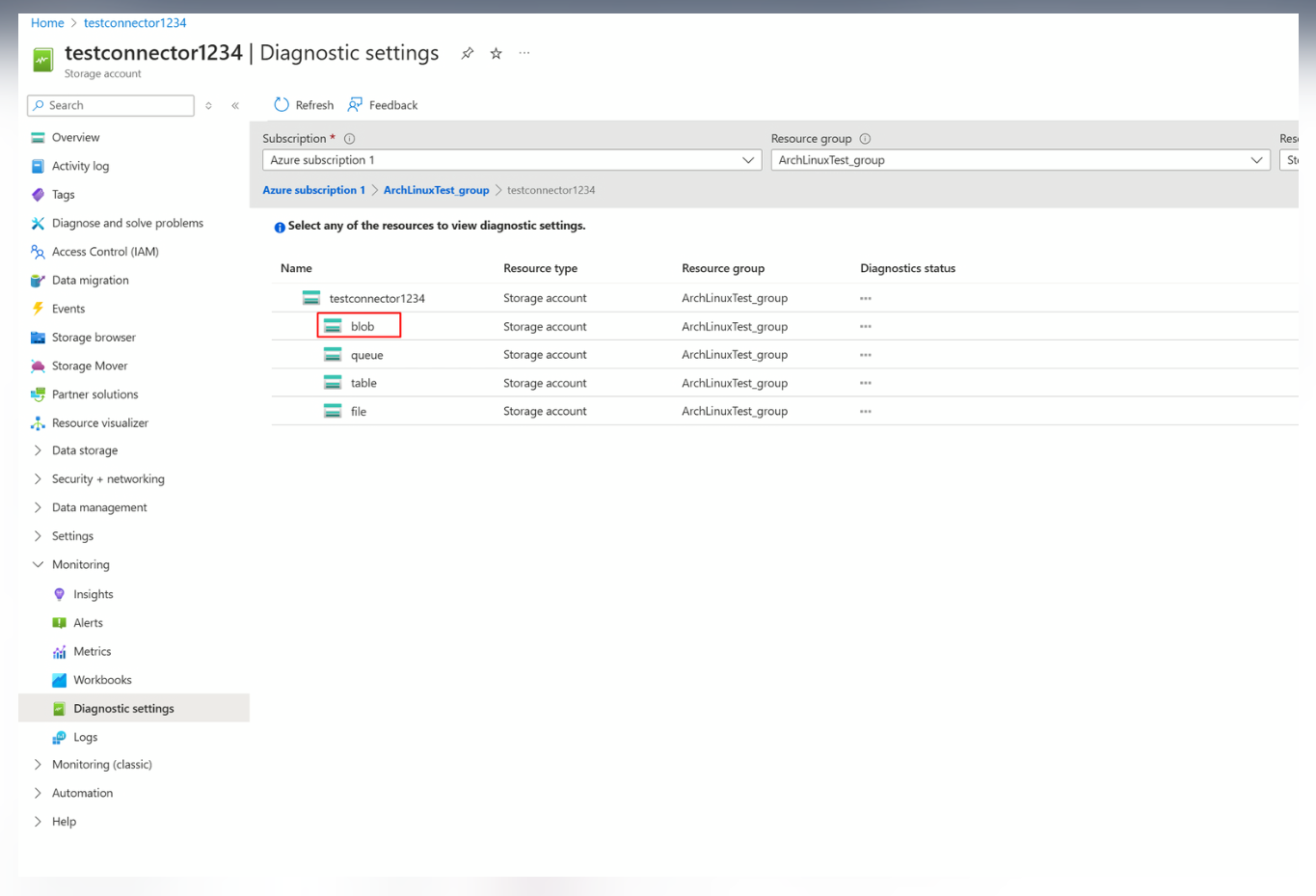 - In the left-hand menu, select Monitoring/Diagnostic settings and click blob.