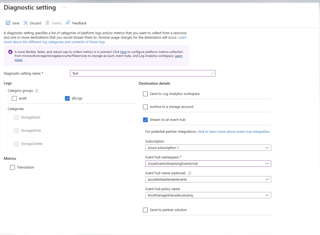 - Select Destination details Stream to an event hub and select newly created Event Hub Namespace and Event Hub.
