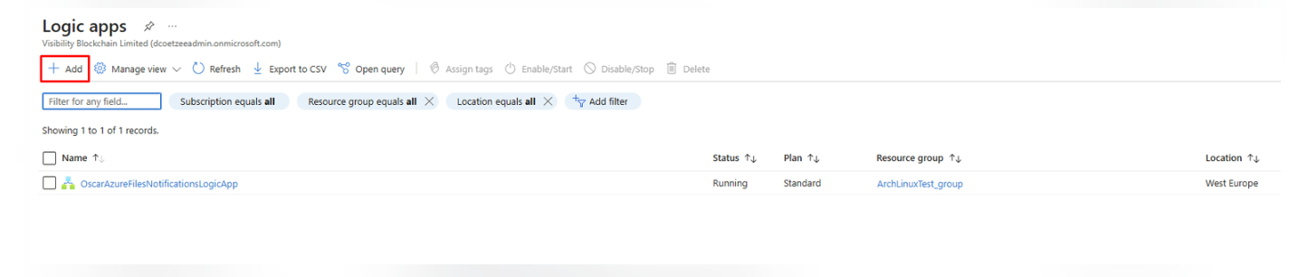 - In newly created logic app click on Workflows/Workflows and then +Add button.