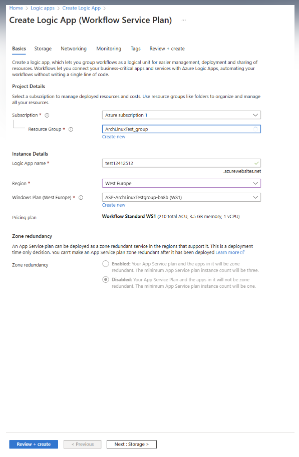 - In Create Logic App (Workflow Service Plan) Window fill in the details and click Review + create: