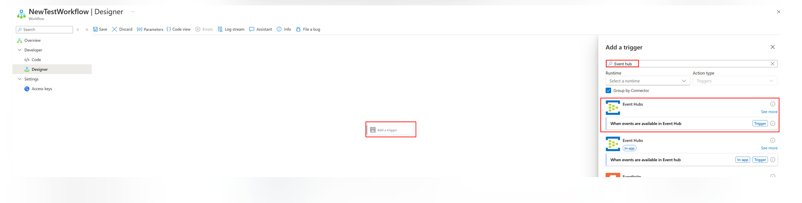 - In created workflow go to Developer/Designer and click on Add a trigger, then in search type Event hub and