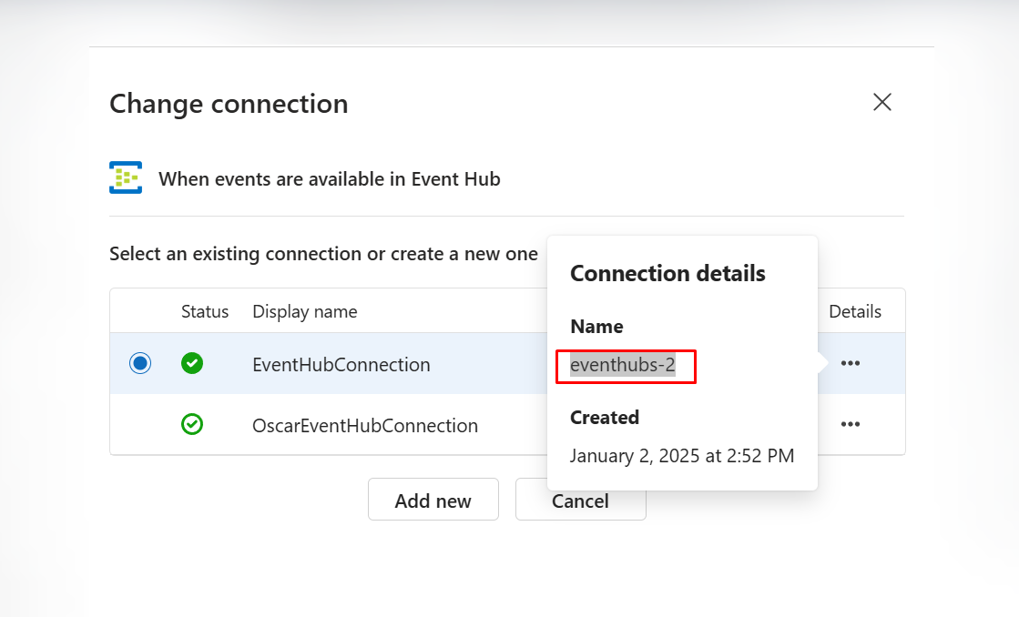 {Connection string–primary key}from step 3.6.c. - On the Change Connection tab, click Details and copy the Name from the connection details. Save