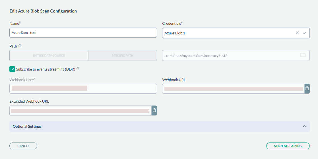 - Within the Edit Azure Blob Scan Configuration page, check Subscribe to events streaming (DDR).