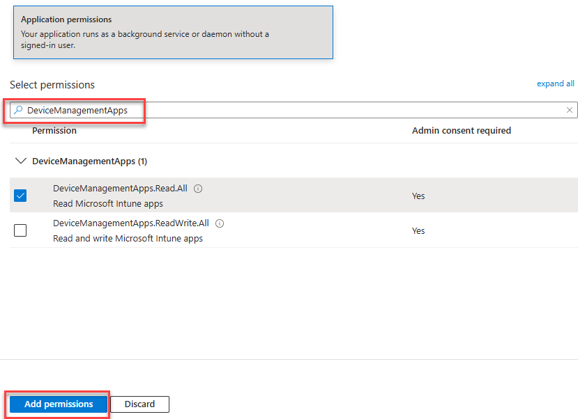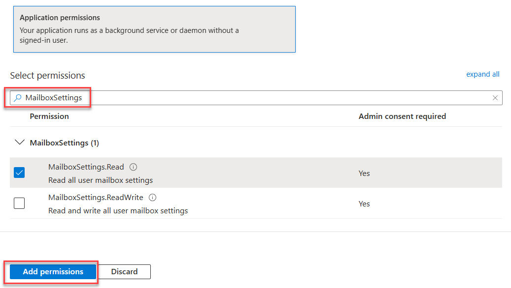 Permissions required - For Scanning Microsoft Graph > Application permissions > Mail > Mail.Read and click Add permissions. Microsoft Graph > Application permissions > User > User.Read.All and click Add permissions. Microsoft Graph > Application permissions > Directory > Directory.Read.All and click Add permissions. Microsoft Graph > Application permissions > DeviceManagementApps > DeviceManagementApps.Read.All and click Add permissions. Microsoft Graph > Application permissions > MailboxSettings > MailboxSettings.Read and click Add permissions.