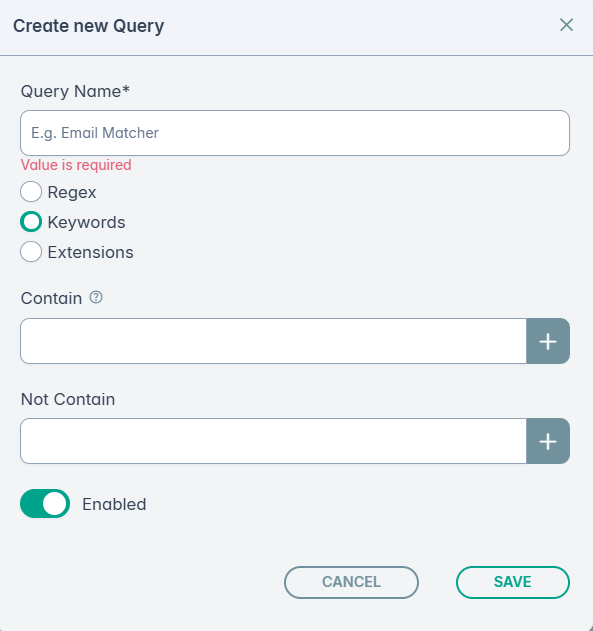 - Select one of Regex, Keywords, or Extensions. This defines where the search base of the detector will look (i.e. search through the contents of a file or the file path).