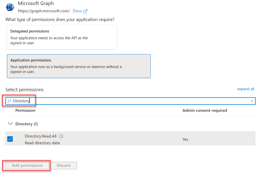 Microsoft Graph > Application permissions > Directory > Directory.Read.All and click Add permissions.