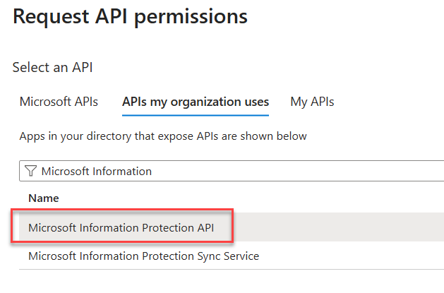APIs my organization uses > Microsoft Information Protection API > Application permissions > InformationProtectionPolicy.Read.All and click Add permissions.