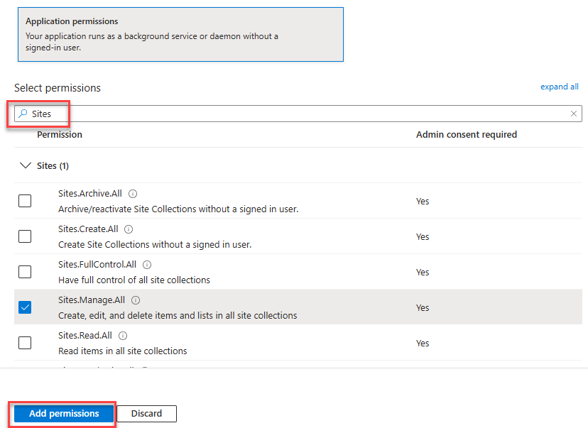 Microsoft Graph > Application permissions > Sites > Sites.Manage.All and click Add permissions.