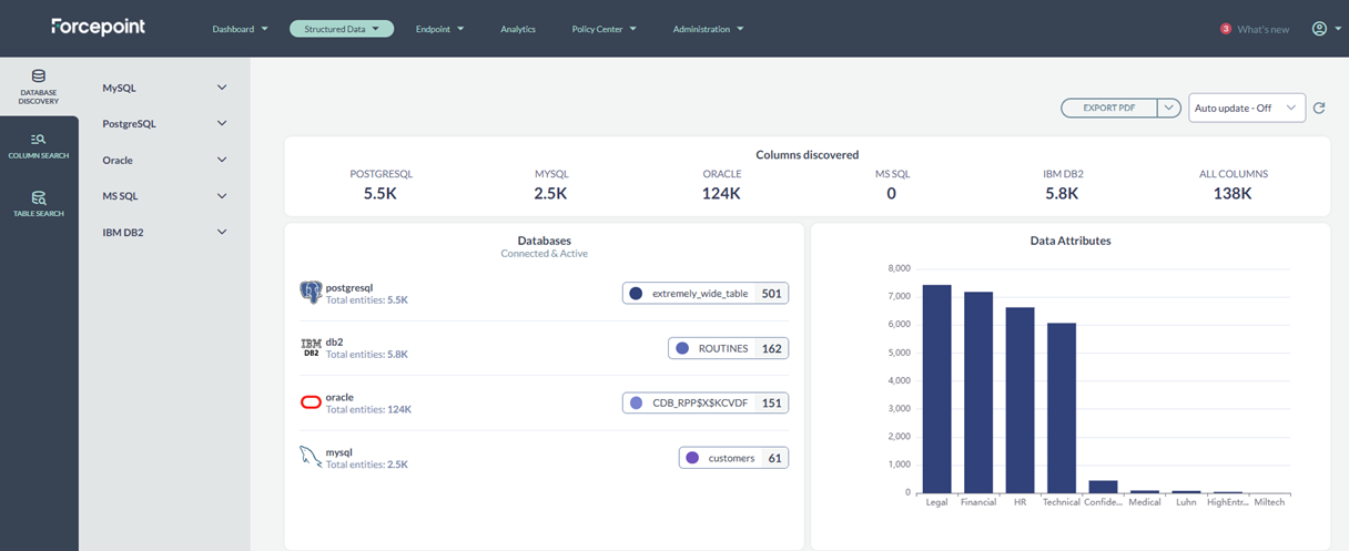 Structured data support in Forcepoint DSPM extends data security posture management beyond unstructured environments, enabling organizations to discover, classify, and protect sensitive data residing in structured repositories such as databases, data warehouses, and cloud-native storage services.