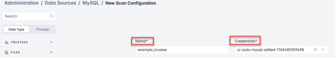 - If the connection succeeds, the New Scan Configuration page appears. Enter a Name and select the specific credential from the drop down.