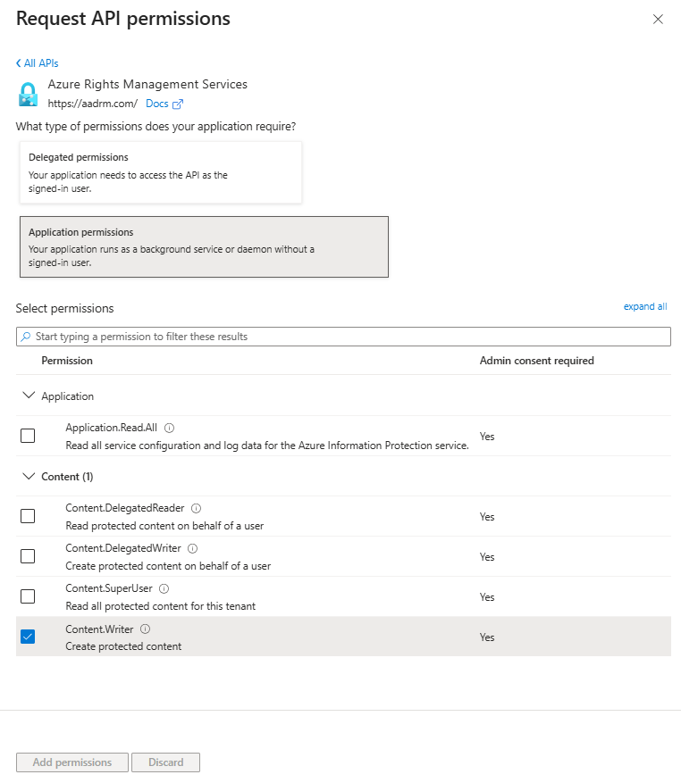 - Azure Rights Management Services > Application permissions > Content.Writer
