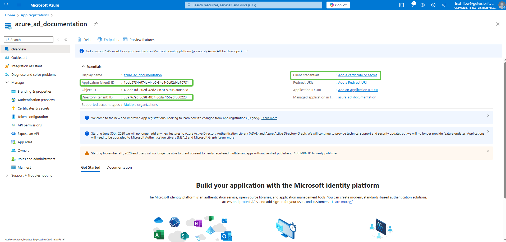 Note the Application (client) ID, Directory (tenant) ID values. Next, click Add a certificate or secret next