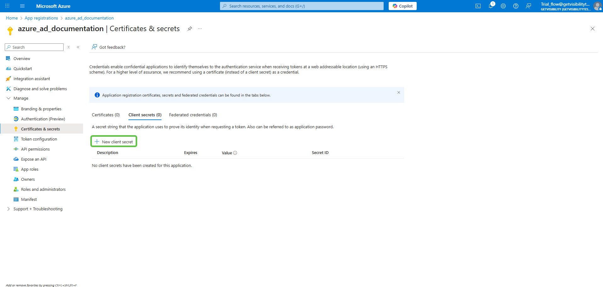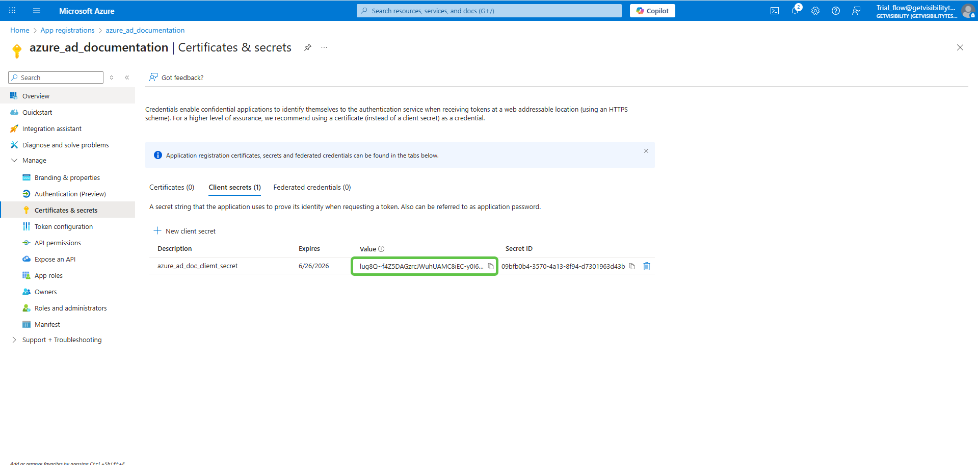 Once a client secret is created, note its Value and store it somewhere safe. This value cannot be viewed once this page is closed.