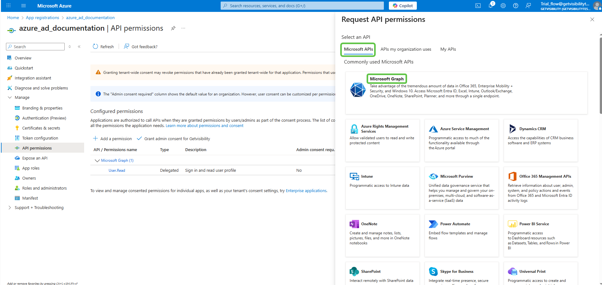 Navigate to Manage > API permissions on the left menu, and Add a permission. You must add all the permissions as listed below.