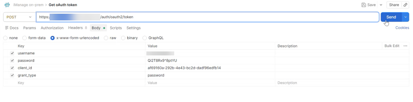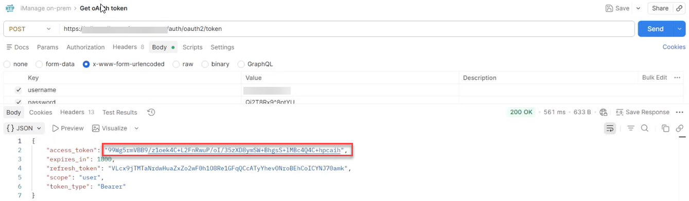 Thecurlcommand to get the Access token:curl -k --location "https://{hostname}/auth/oauth2/token" --header "Content-Type: application/x-www-form-urlencoded" --data-urlencode "username={username}" --data-urlencode "password={password}" --data-urlencode "client_id={client_id}" --data-urlencode "grant_type=password"Note: The username, password, client ID, and host values will vary by customer. - Get Customer ID