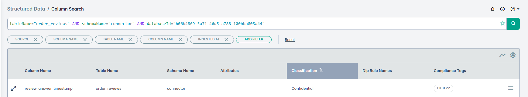 In the Table Search view, you can use GQL queries to filter and display selected tables, corresponding schema name, classification and other details. Following is an example: