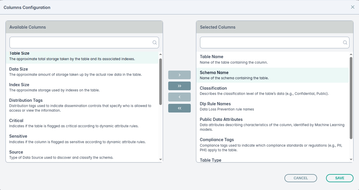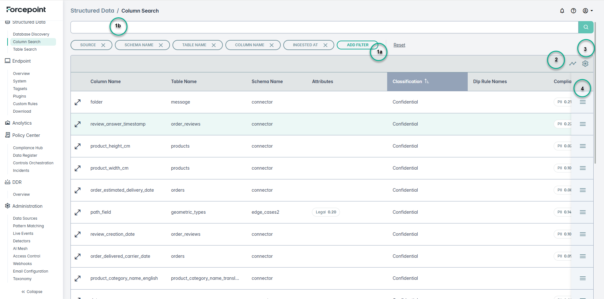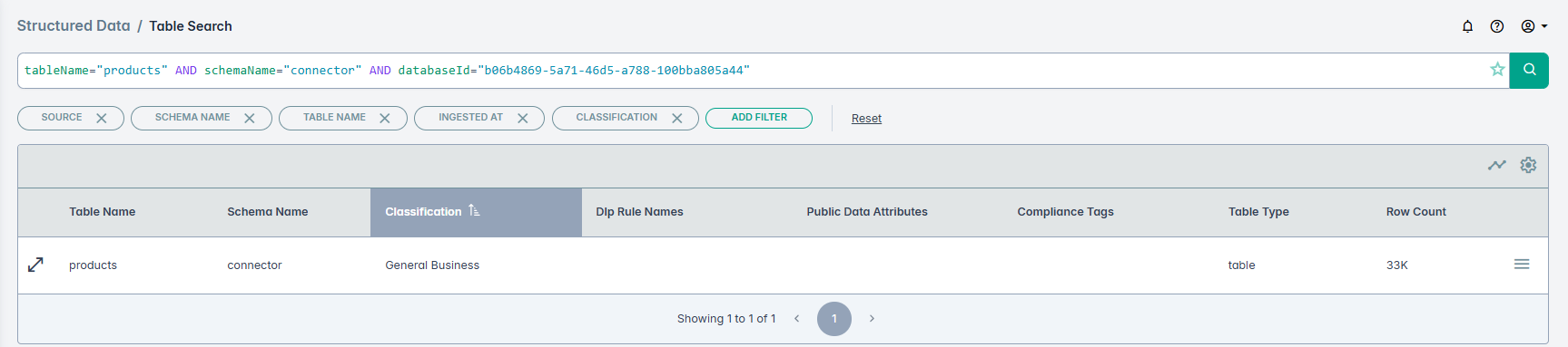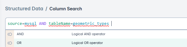 In the Column Search view, you can use GQL queries to filter and display selected columns, corresponding table name, schema name, classification and other details. Following is an example: